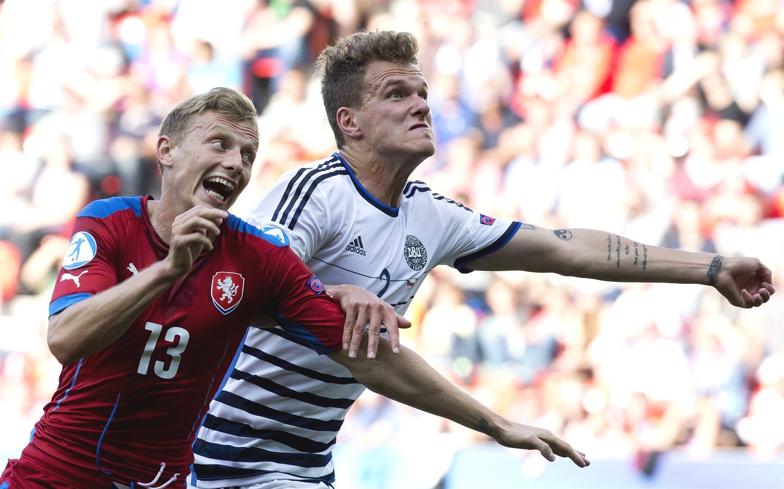 Český fotbalista Ladislav Krejčí (vlevo) v souboji s Alexandrem Scholzem z Dánska.
